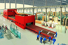 玻璃鋼化爐又名玻璃鋼化設備,通常采用物理方法,將玻璃加熱到軟化點附近(650℃),吹風驟冷,在玻璃表面形成壓應力層、內(nèi)部形成拉應力層;當玻璃受到外力作用時,壓應力層可將部分拉應力抵消,