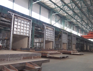 臺(tái)車式爐屬于間隙式變溫爐,主要用于鋼錠鍛前加熱或工件熱處理,因此其爐型可分為臺(tái)車式加熱爐和臺(tái)車式熱處理爐。爐子由爐膛、可移動(dòng)臺(tái)車及爐門三部分組成。
